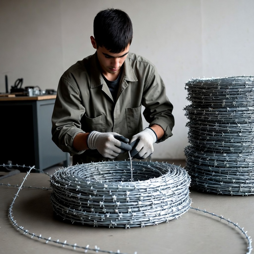 A young man with short dark hair wears a green shirt and white gloves while handling barbed wire in a workshop. He leans over large coils of barbed wire on a table next to stacked rolls. Tools and a workbench are visible in the industrial setting with a plain background.