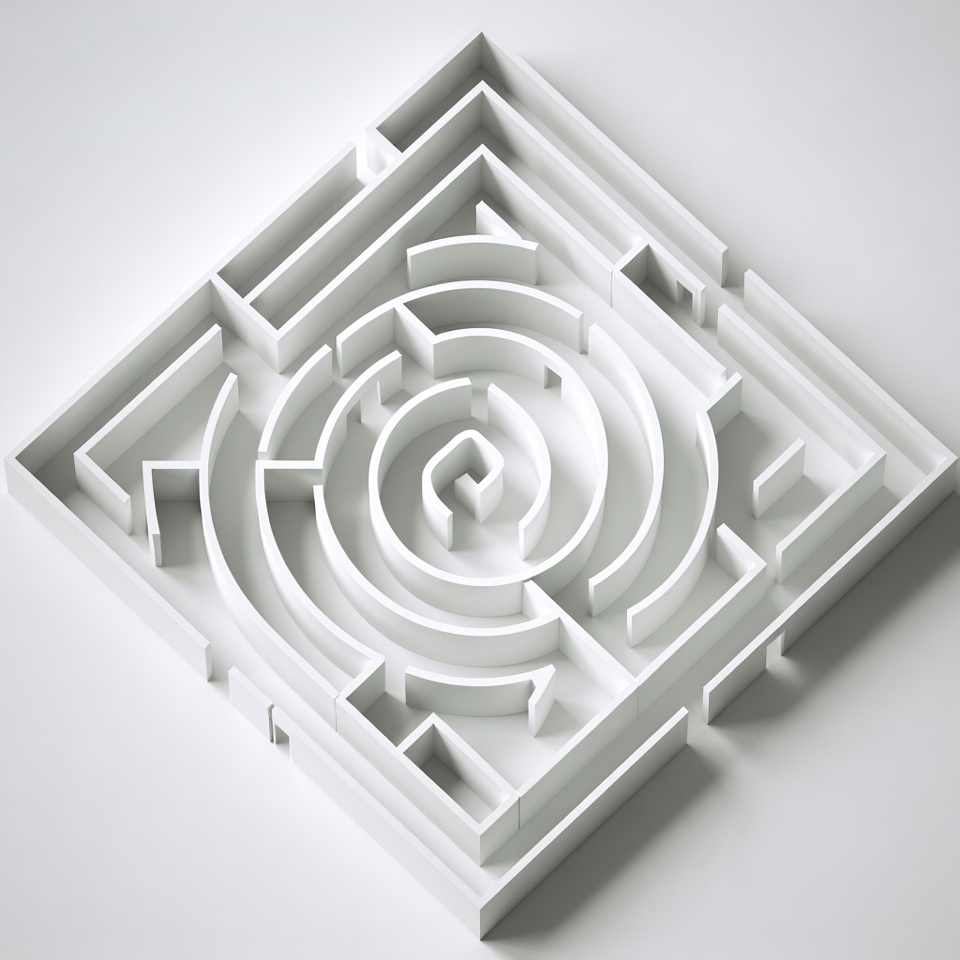 A three-dimensional white maze with a square shape and complex pathways viewed from above at an angle. The labyrinth features twisting corridors leading to a central spiral core. It is rendered in a clean, minimalist style against a plain white background.