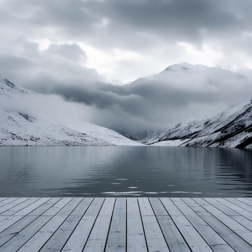 A serene lake reflects snow-covered mountains under heavy gray clouds. A wooden pier extends into the calm water from the foreground. Misty fog partially obscures the rugged peaks.