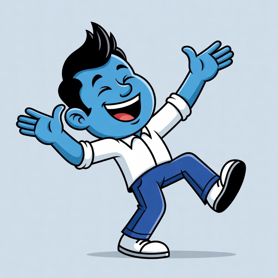 A cartoon illustration of a blue-skinned man with black hair dances joyfully with arms raised wide. He wears a white dress shirt, blue pants, and white shoes on a light blue isolated background. His face shows a big open-mouthed smile and squinted eyes expressing happiness.