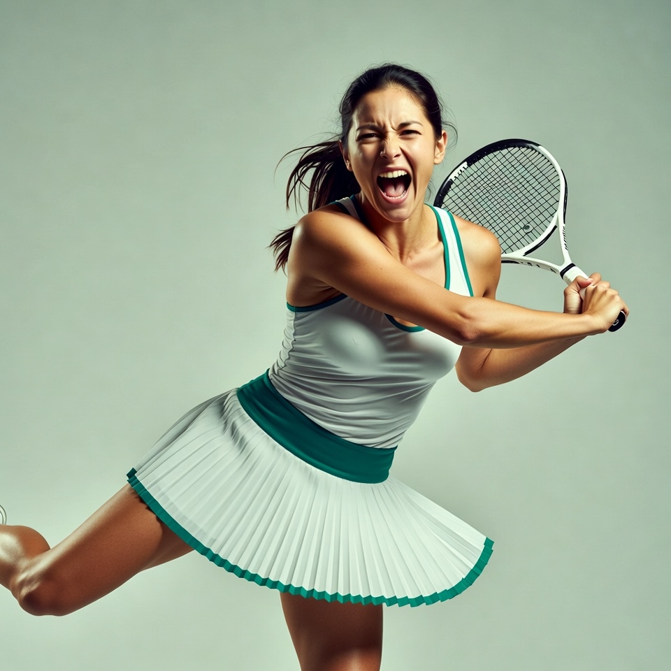 A Latina woman with dark hair in a ponytail intensely serves a tennis ball while holding a racket with both hands. She wears a white tank top with green trim and a matching pleated white skirt with green accents, captured mid-action with one leg lifted. Her mouth is open wide in a yell against a plain gradient background.
