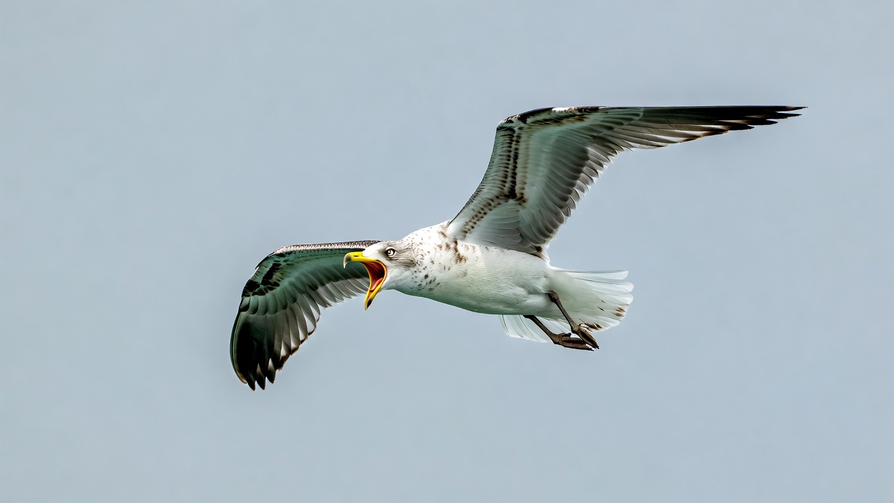 Gull flying with open beak