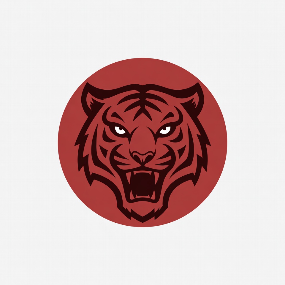 animal, bared teeth, bold lines, circular, clipart, emblem, fierce tiger, graphic design, illustration, isolated background, mascot, predator, red background, roaring tiger, snarling, stripes, tiger head, wildlife, tiger