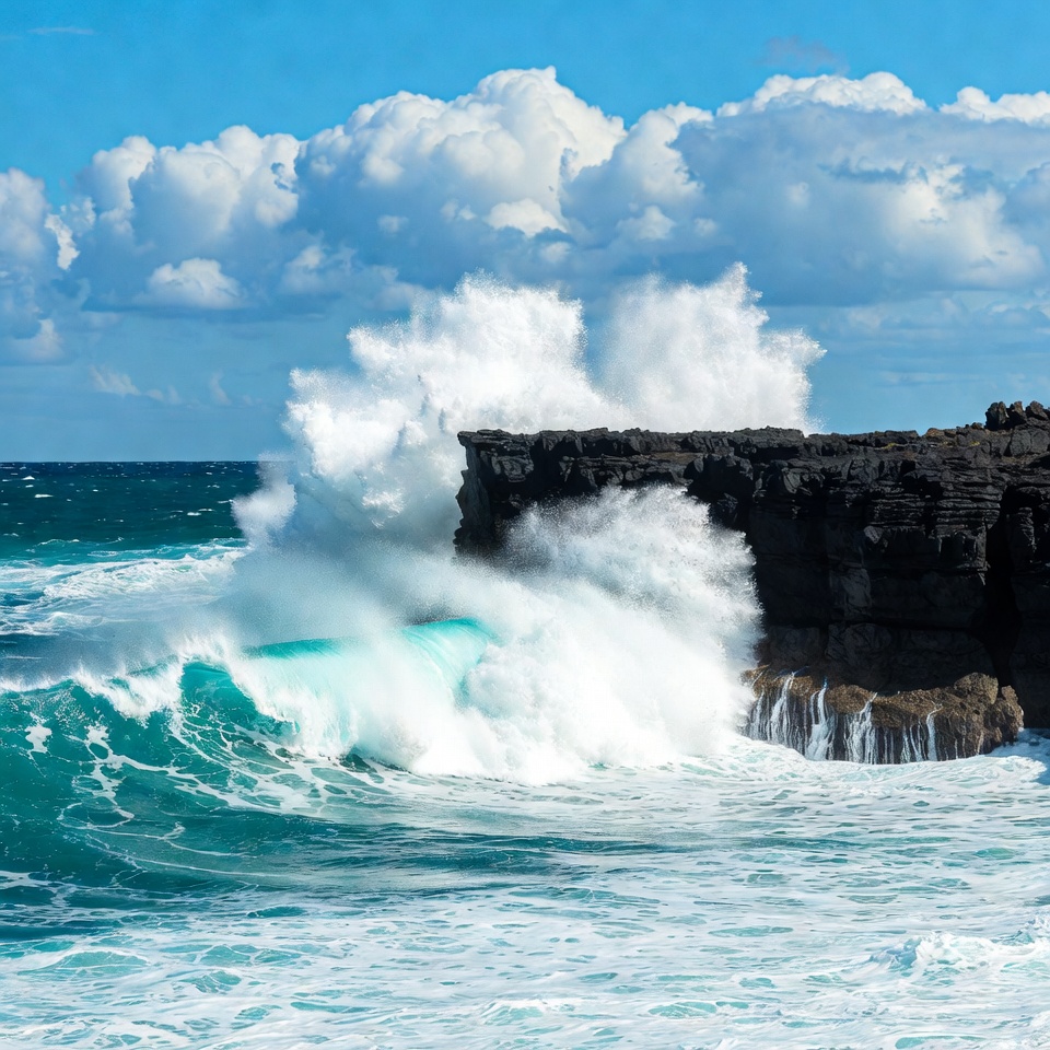 Powerful ocean waves crash dramatically against a dark rocky cliff under a bright blue sky with fluffy white clouds. Turquoise water surges upward in white foam sprays. The scene features a vast sea extending to the horizon.