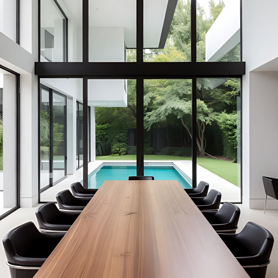 architecture, backyard pool, black chairs, contemporary house, dining area, floor-to-ceiling windows, furniture, glass walls, green garden, high-end decor, home design, indoor outdoor, infinity pool, leather chairs, luxury interior, minimalist decor, nature view, open space, outdoor pool, pool view, sleek design, trees, white walls, wooden table, modern dining room