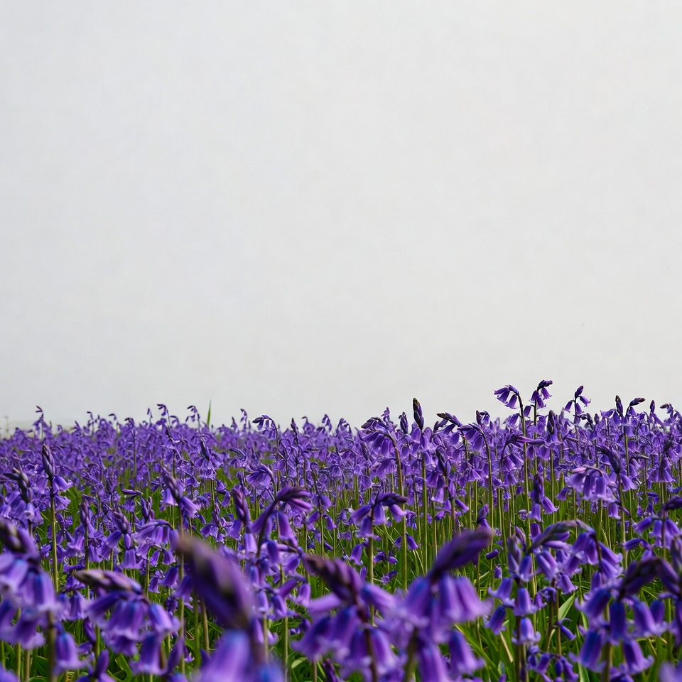 blooming flowers, bluebells, field, floral landscape, flower field, flower meadow, green stems, isolated background, lavender flowers, meadow, nature, outdoors, purple blooms, purple flowers, spring flowers, white sky, wildflowers, bellflowers