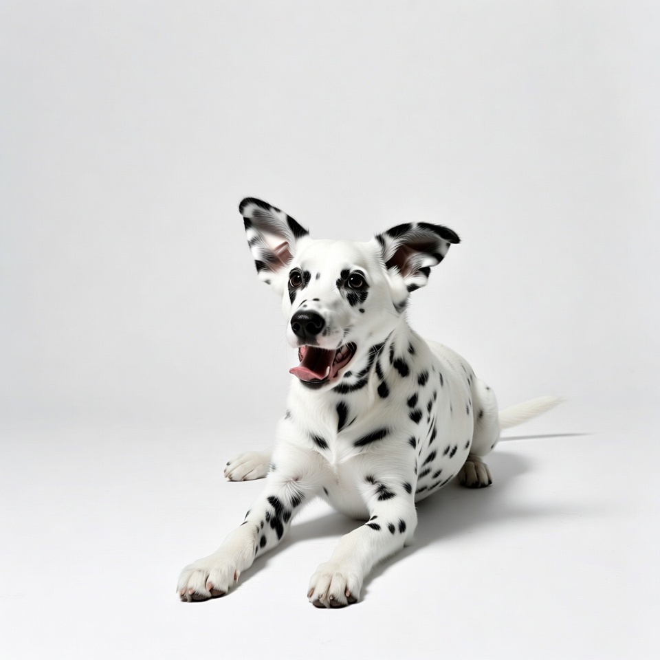 A young Dalmatian puppy with black spots lies on its side on a plain white background. Its mouth is open in a happy expression with tongue out, and its floppy ears are perked up. The puppy stretches its front paws forward while looking directly at the camera.