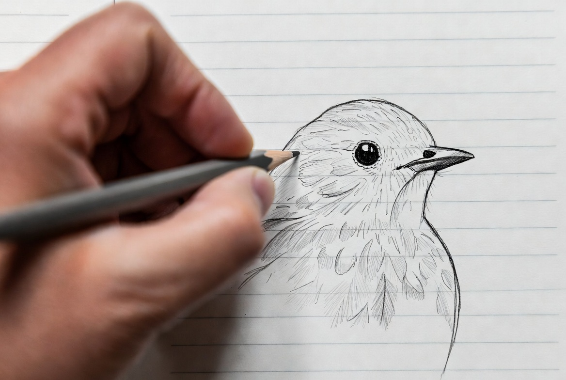 artist hand, artwork, beak, bird, bird portrait, detailed sketch, drawing bird, eyes, feathers, graphite art, hand, illustration, lined paper, notebook paper, paper, pencil, pencil sketch, sketchbook, small bird, wildlife art, hand drawing