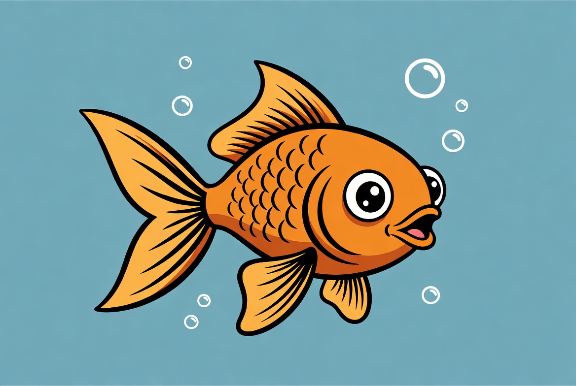 A vibrant orange cartoon goldfish swims in a light blue underwater scene. It has large expressive eyes, a smiling mouth, and flowing fins. Surrounding bubbles add to the playful aquatic environment.