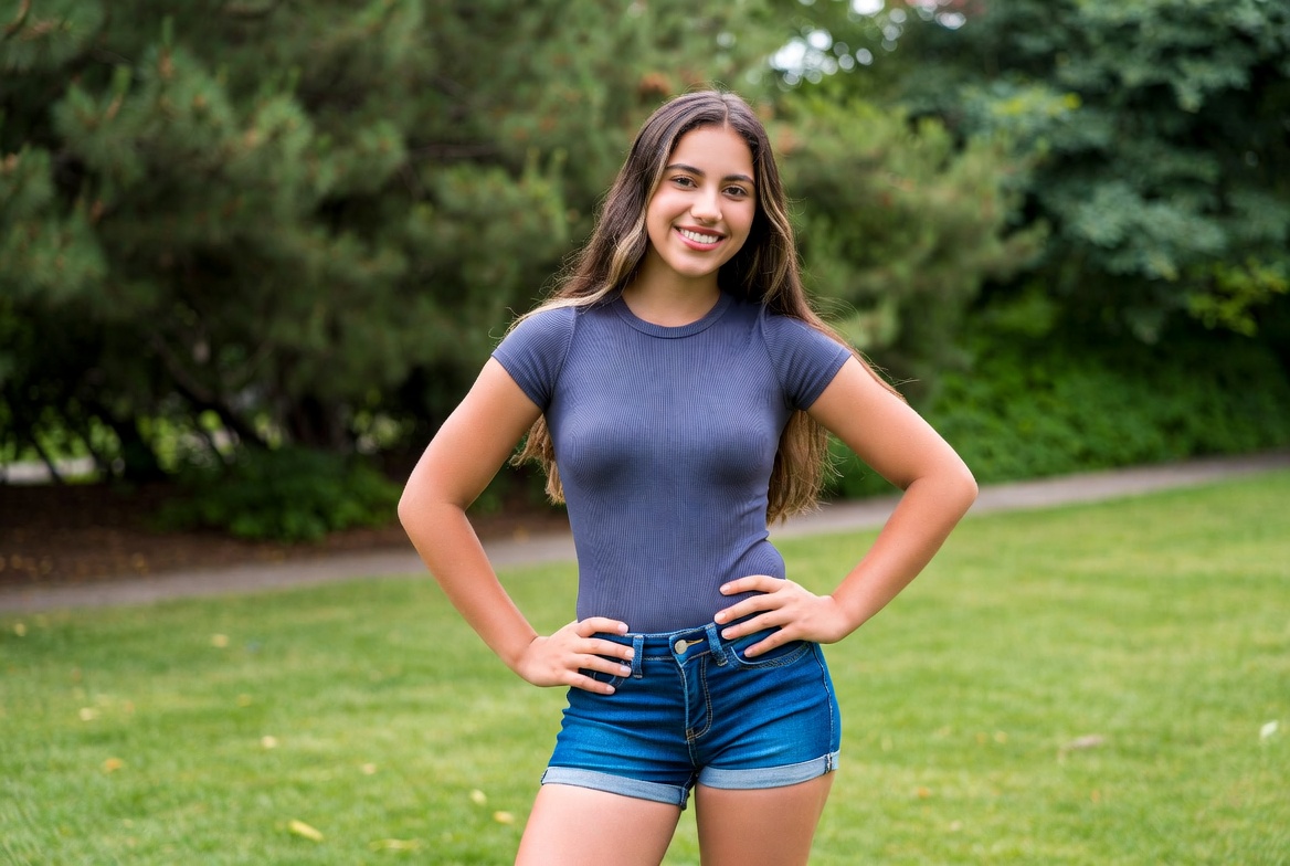 A young Latina woman with long brown hair smiles confidently while standing in a lush green park. She wears a fitted gray short-sleeve top and denim short shorts, with hands on her hips. Tall trees and a paved path form the background.