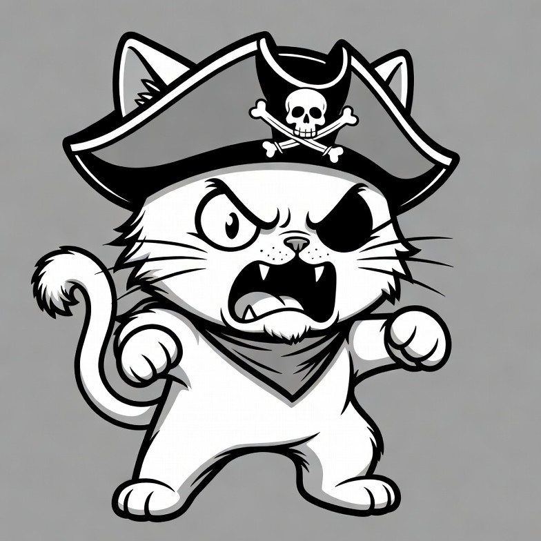 angry cat, animal, bandana, cartoon, cat, clipart, cute pirate, eyepatch, fierce cat, illustration, isolated background, pirate, pirate hat, skull crossbones, snarling cat, vector art, white cat, pirate cat