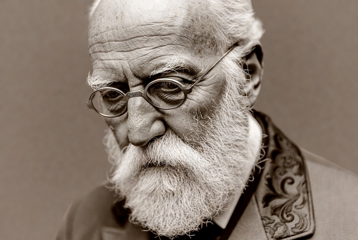 A close-up portrait of an elderly White man with a long white beard and thick white hair. He wears round wire-rimmed glasses and a formal jacket with ornate collar details. His expression is serious against a neutral background.