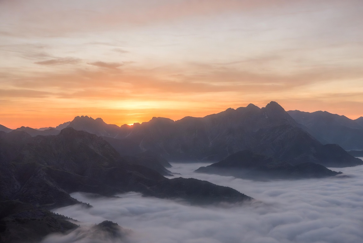 aerial view, clouds, colorful sky, dawn, dramatic peaks, fog, jagged rocks, landscape, misty mountains, mountain range, mountains, natural wonder, nature, orange sky, outdoor scenery, peaks, rocky mountains, scenery, sea of clouds, silhouettes, sky, sunlight, sunset, valley fog, sunrise