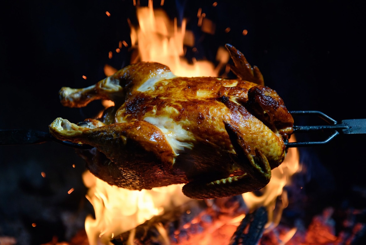 barbecue, bbq, chicken roast, cooking, dark background, delicious, embers, fire, flames, food photography, golden skin, grill, juicy, meat, outdoor cooking, poultry, rotisserie, savory, skewer, spit roast, whole chicken, roasted chicken