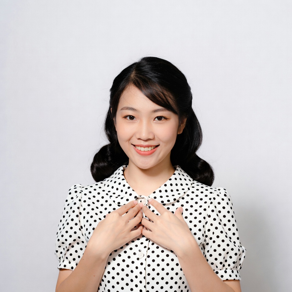 A young Asian woman with black hair styled in double buns smiles warmly at the camera. She wears a white polka dot dress with short puffed sleeves and holds her hands clasped over her chest. She stands against a plain white background.