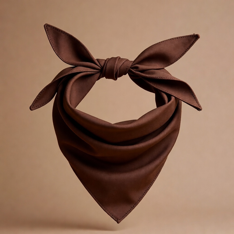 A large brown silk bow tie is tied in a classic bow shape and floats against a beige background. The fabric has a smooth, glossy texture with neatly folded wings and a central knot. It is presented in a clean, isolated view with soft lighting.
