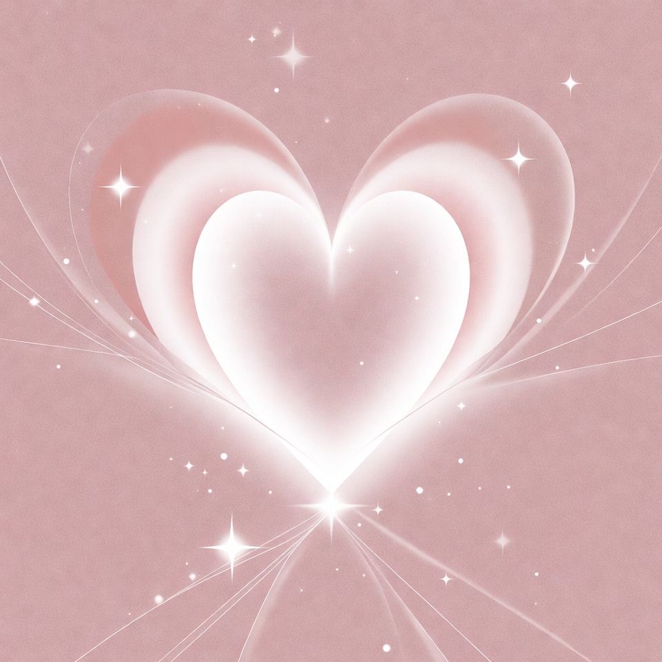 A large glowing white heart with layered translucent edges floats on a soft pink background. Sparkling stars surround the heart, adding a magical effect. The design features smooth gradients and ethereal light effects.