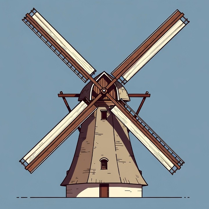 A detailed line art illustration of a traditional windmill with large wooden blades in an X shape. The windmill features a beige stone body, brown sails, and a small door at the base. It stands isolated against a solid light blue background.