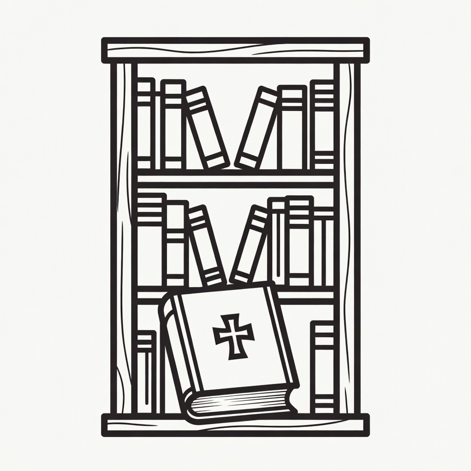 A black line art illustration depicts a tall wooden bookshelf filled with books on multiple shelves. A prominent open Bible with a cross symbol leans against the books in the center. The design features clean outlines on an isolated white background.