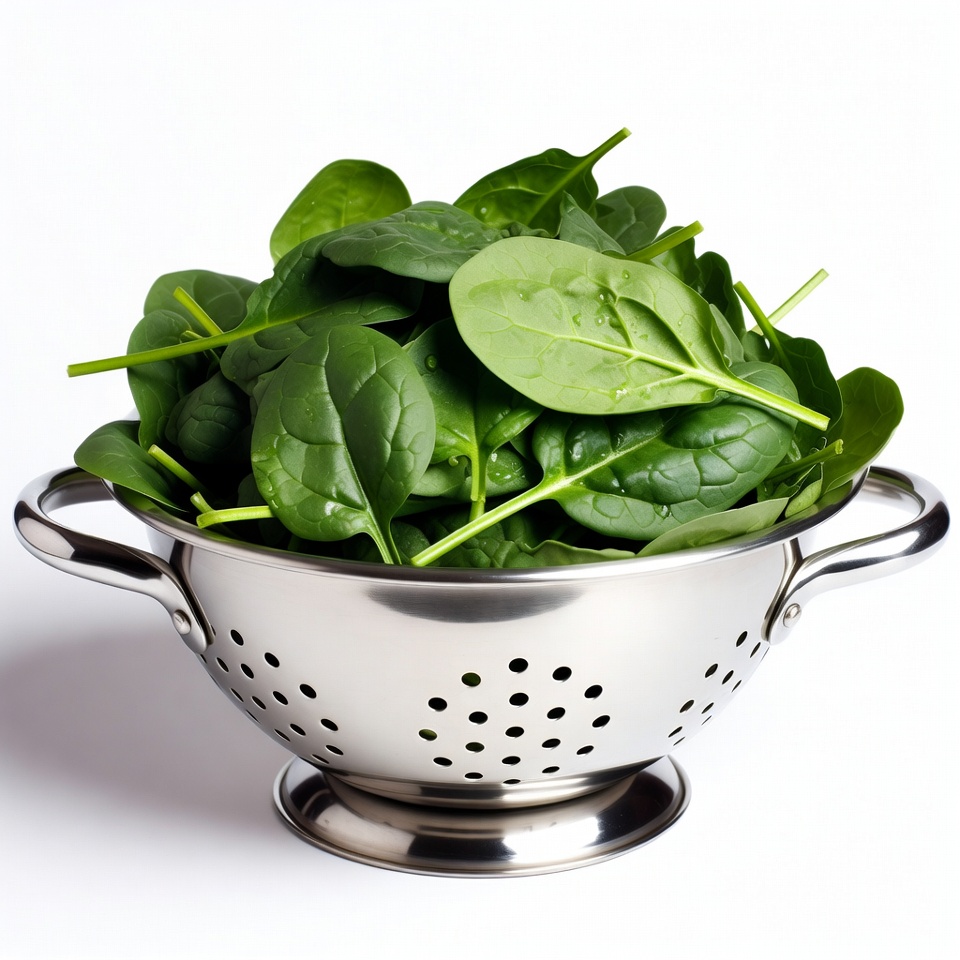A pile of vibrant green spinach leaves fills a shiny stainless steel colander. Water droplets glisten on the broad, veined leaves. The colander stands on a white background with a subtle shadow.