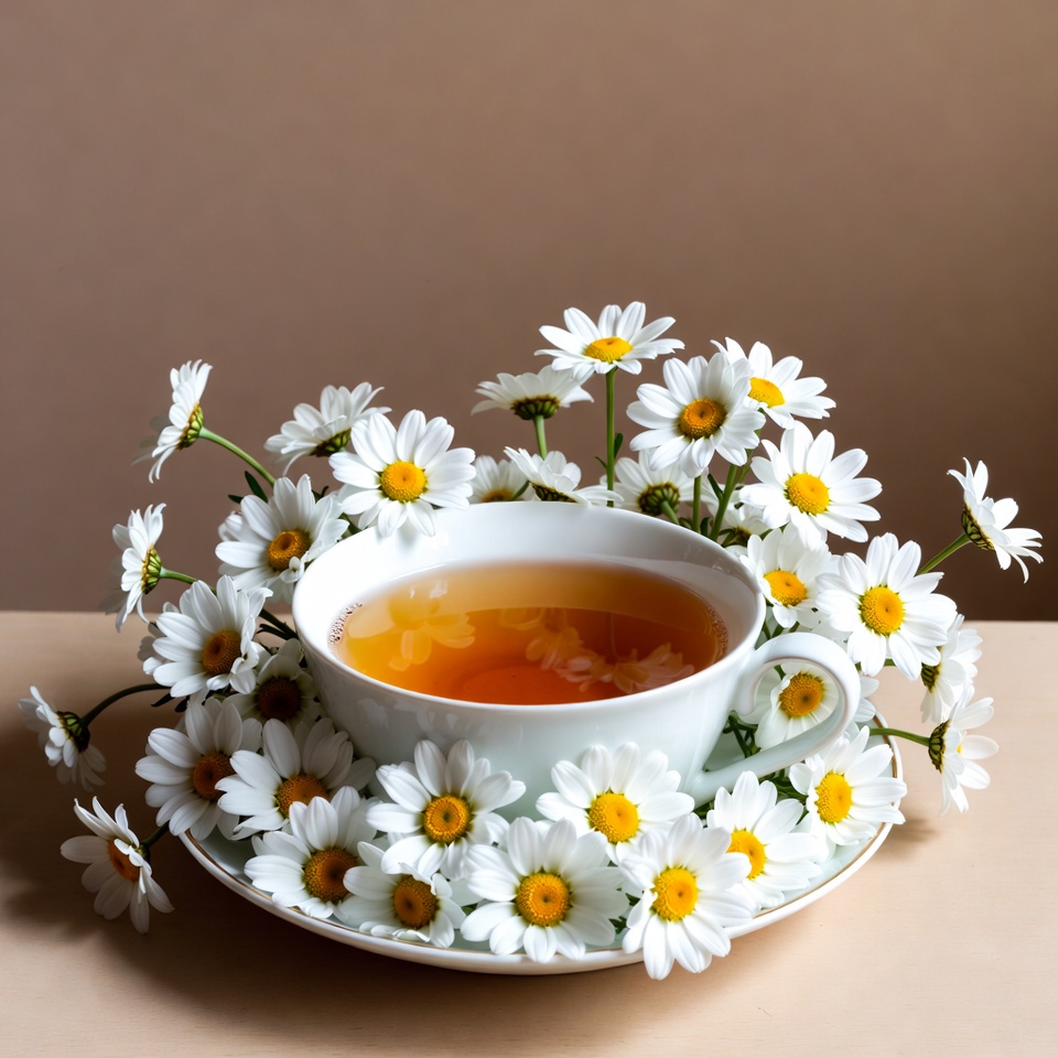 A white teacup filled with steaming amber tea sits on a saucer. It is encircled by a wreath of fresh white daisies with yellow centers. The setup is placed on a beige surface with a neutral background.