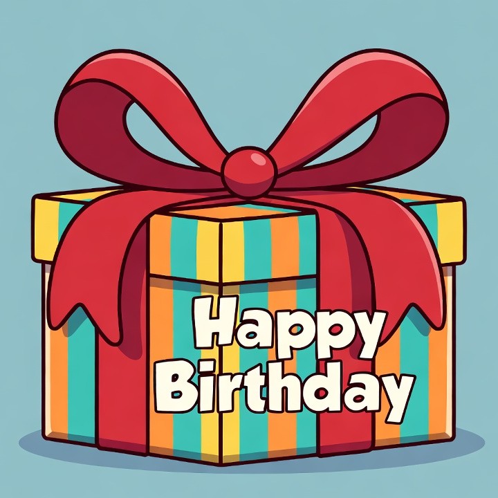 birthday gift, blue background, bow, cartoon, celebration, clipart, festive, gift box, green stripes, illustration, isolated background, orange stripes, party, present, red ribbon, striped box, yellow stripes, happy birthday