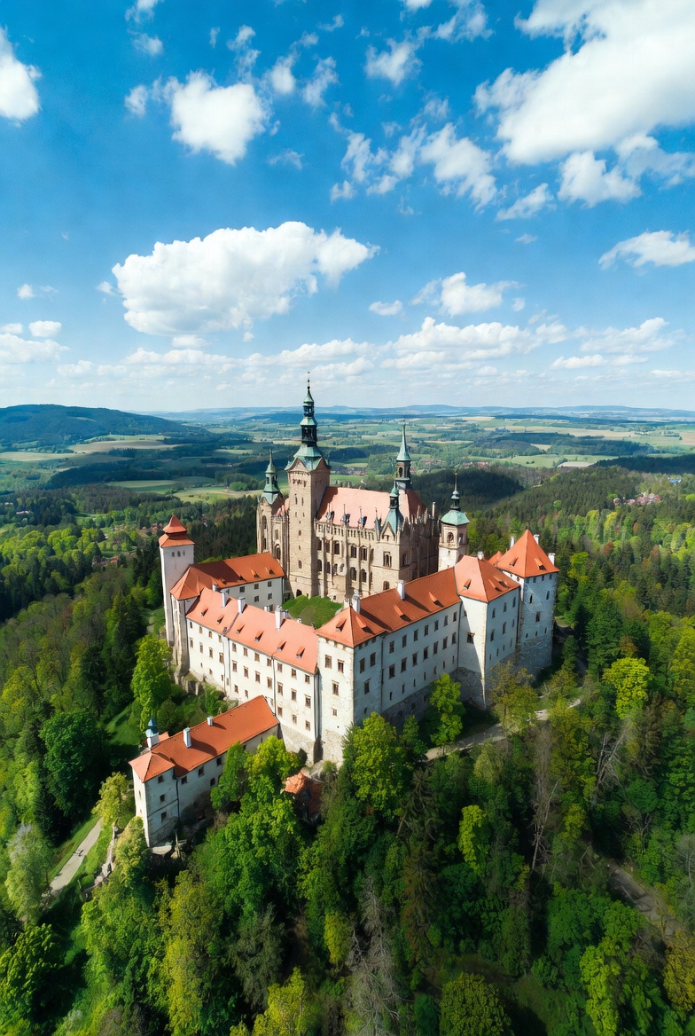 Moszna Castle, Poland, aerial view, architecture, blue sky, cloudy sky, european castle, forest, green trees, hill, hilltop, historic building, landscape, panoramic view, red roofs, scenic, surrounded by trees, towers, white clouds, castle