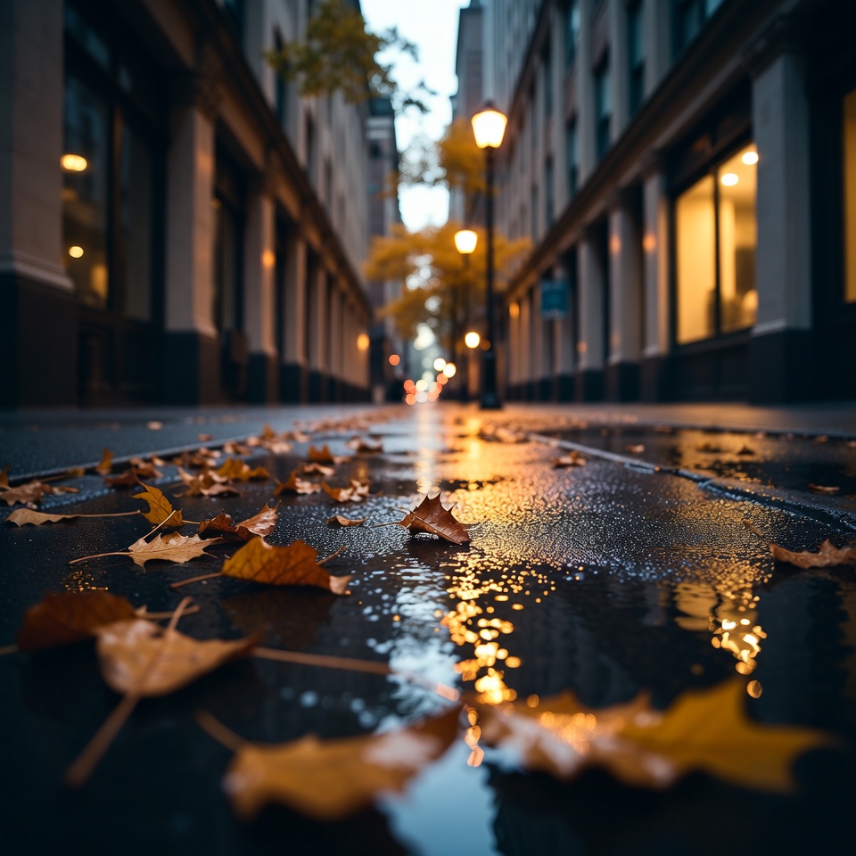 architecture, atmospheric, bokeh, buildings, city street, dusk, empty street, evening, fall foliage, fallen leaves, foliage, glossy surface, golden hour, leaf litter, modern buildings, narrow alley, orange leaves, paved road, rainy street, reflections, sidewalk, street lamps, streetlights, twilight, urban, wet pavement, yellow leaves, autumn street