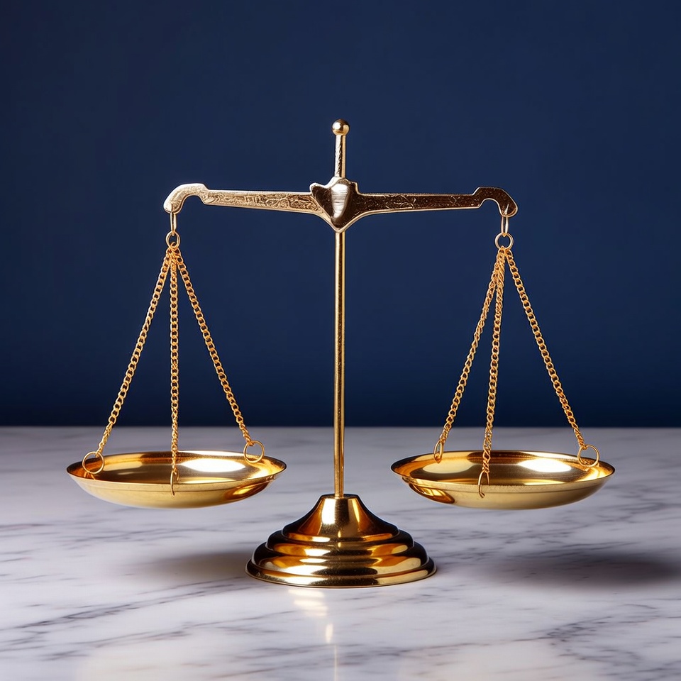 A golden balance scale symbolizing justice stands on a white marble surface. The ornate scale features two suspended gold pans hanging evenly from chains on a central beam. It is set against a dark blue background.