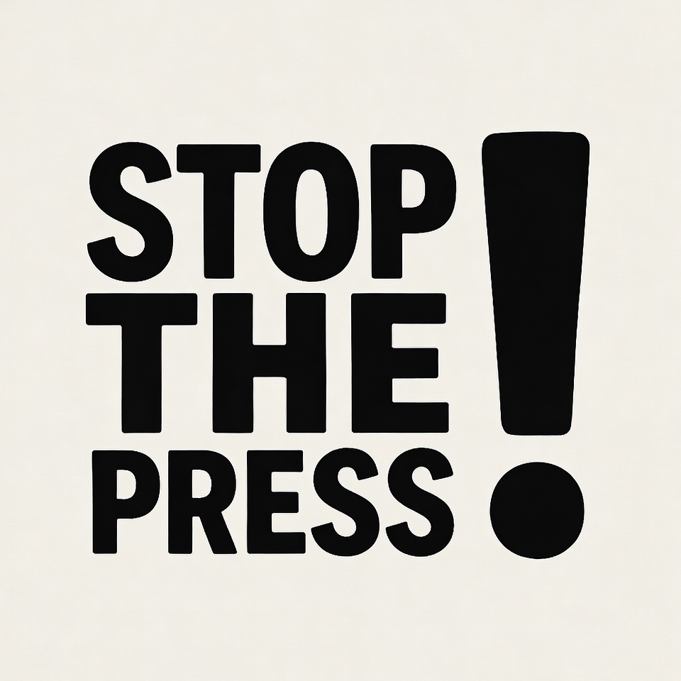 black text, bold text, clipart, exclamation marks, graphic, isolated background, press, protest sign, sign, stop press, typography, warning sign, white background, stop the press