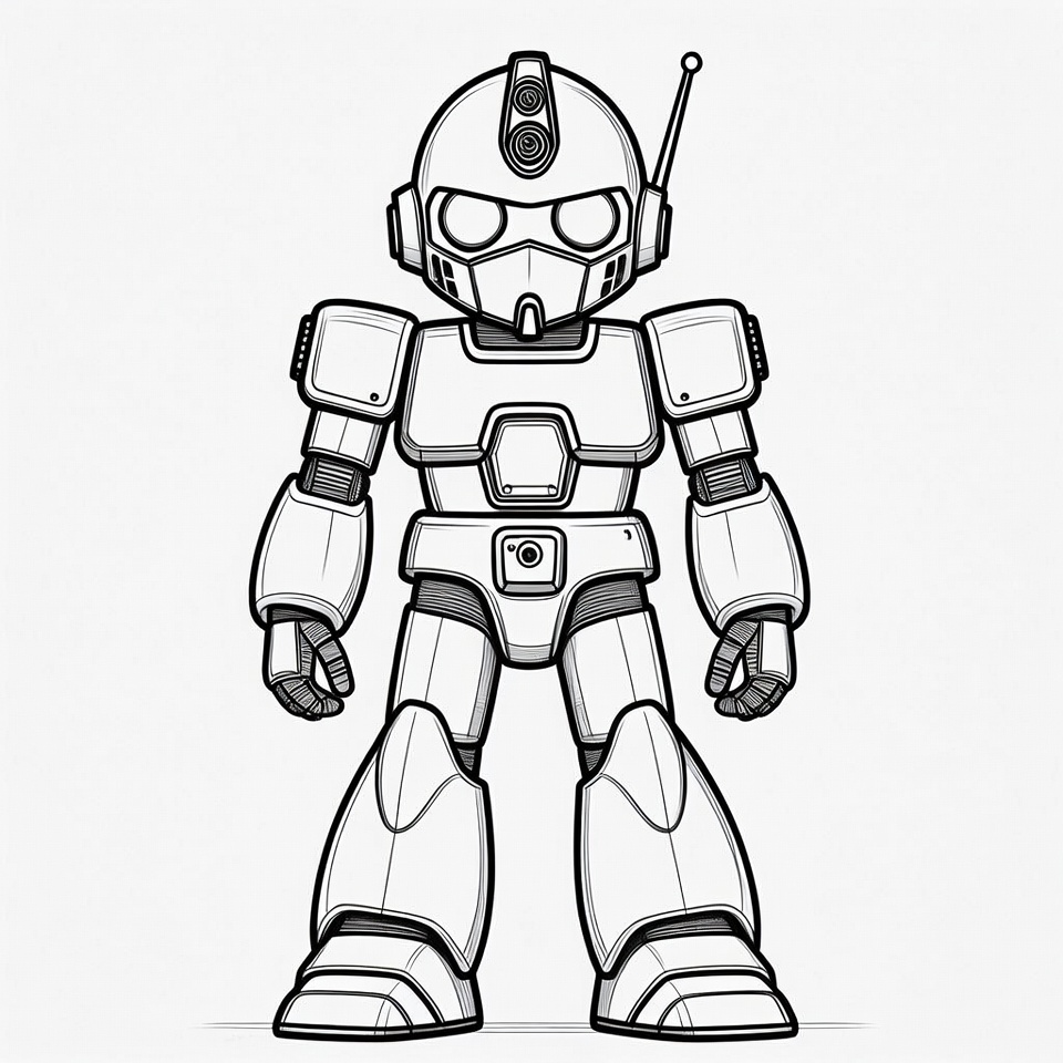 A detailed line art illustration of a humanoid robot stands frontally on a white background. The robot features a large helmet-like head with antennas, glowing eyes, cameras on the chest and head, and bulky armored limbs. It has a cute, chibi-style design with exaggerated proportions.