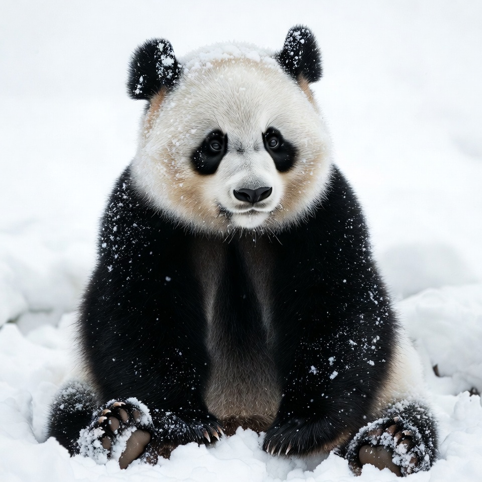 A cute panda bear sits in the snow, covered with fresh snowflakes on its black and white fur. Its large black eyes gaze forward, with snow dusting its ears and paws. The background is a snowy white expanse.