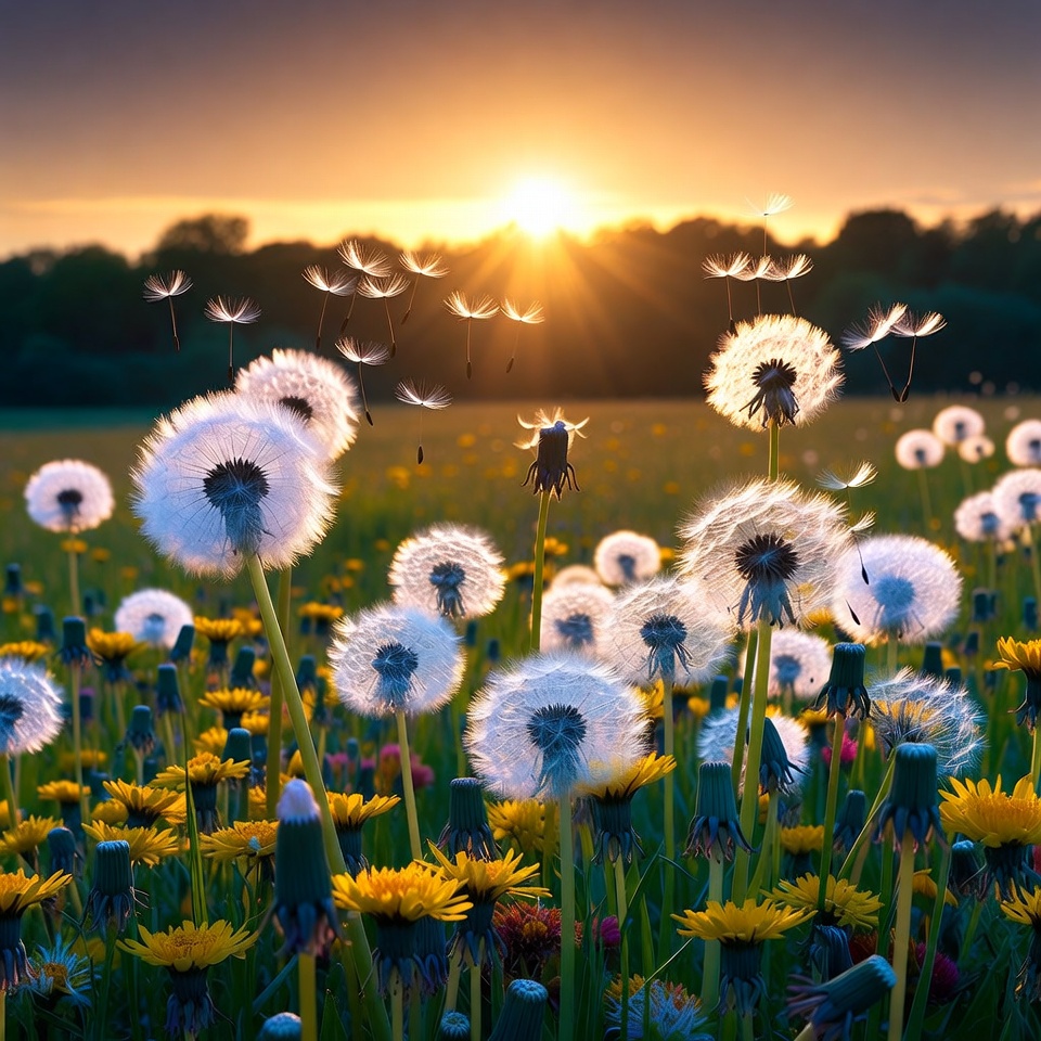 A vibrant field of white dandelions sways in the breeze during a golden sunset. The sun shines brightly behind a tree line, casting warm rays that illuminate floating dandelion seeds. Green grass and yellow flowers surround the fluffy dandelions in the foreground.