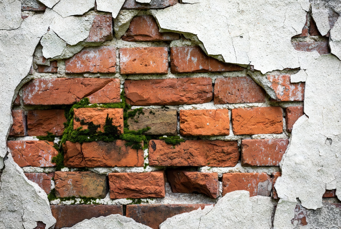A weathered brick wall features large patches of peeling white plaster revealing red bricks underneath. Green moss grows in the crevices between the bricks. The texture shows deterioration and natural overgrowth.