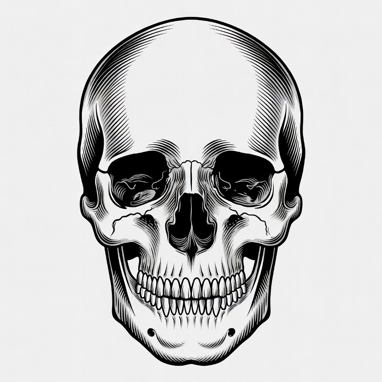 anatomy, black ink, clipart, dark art, death symbol, engraving style, grinning skull, human skull, isolated background, line art, skeletal face, skull illustration, tattoo design, white background, skull