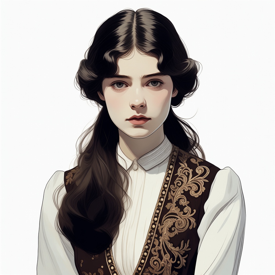 A young woman with long dark wavy hair styled in an Edwardian updo gazes forward against a white background. She wears a white collared blouse topped with a brown embroidered vest featuring intricate gold patterns. Her expression is serene with soft facial features and subtle makeup.