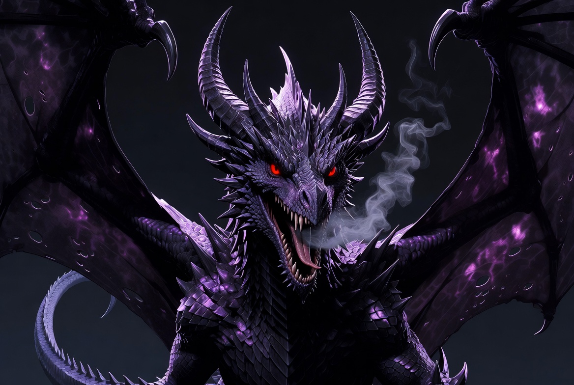 A fierce purple dragon with large horns and wings faces forward on a dark background. It has glowing red eyes, an open mouth revealing sharp teeth, and purple smoke billowing from its jaws. The detailed scales and claws emphasize its menacing appearance.