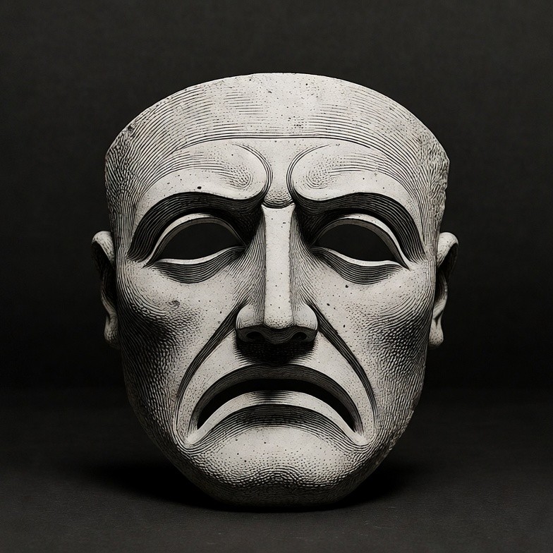 Greek mask, ancient mask, artistic sculpture, carved face, classical art, downturned mouth, dramatic expression, frowning face, furrowed brows, gray stone, hollow eyes, isolated background, mask, sculpture, stone sculpture, theater mask, tragedy mask