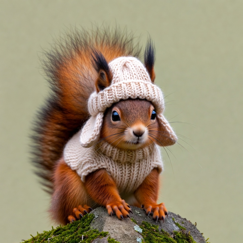 A cute red squirrel with fluffy fur wears a white knitted hat with ear flaps and a matching sweater. It stands on a moss-covered rock with its paws forward and big eyes looking at the camera. The background is a soft green gradient.