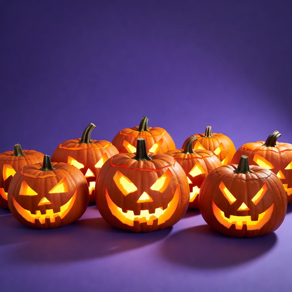 Multiple carved jack-o'-lantern pumpkins with glowing orange faces are arranged together. They feature scary expressions with jagged teeth and eyes lit from within. The dark purple background provides a Halloween-themed contrast.