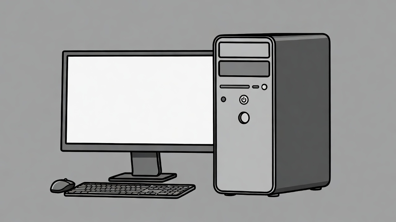 PC tower, blank screen, clipart, computer, computer mouse, computer setup, digital drawing, illustration, isolated background, keyboard, line drawing, monitor, office equipment, technology, desktop computer