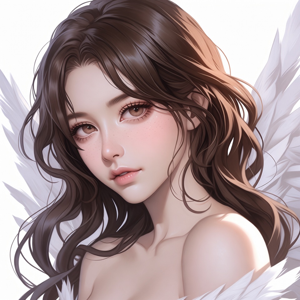 A beautiful anime girl with long wavy brown hair and large expressive eyes gazes forward. She has large white feathered wings emerging from her back and is shown from the shoulders up on a white background. Her skin is fair with subtle blush on her cheeks.