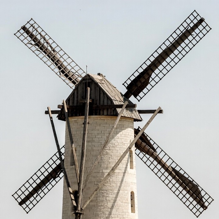architecture, blades, brick tower, clear sky, countryside, europe, historic, landmark, mill, outdoor, rural, sails, sloped roof, structure, tower, traditional windmill, white brick, wooden blades, wooden frame, windmill
