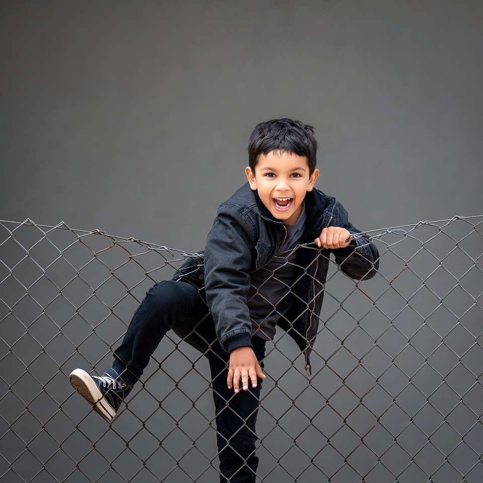 A young boy with short dark hair smiles widely while hanging on a chain link fence. He wears a black jacket, dark pants, and black sneakers, with one leg lifted playfully. The background is a plain gray wall.