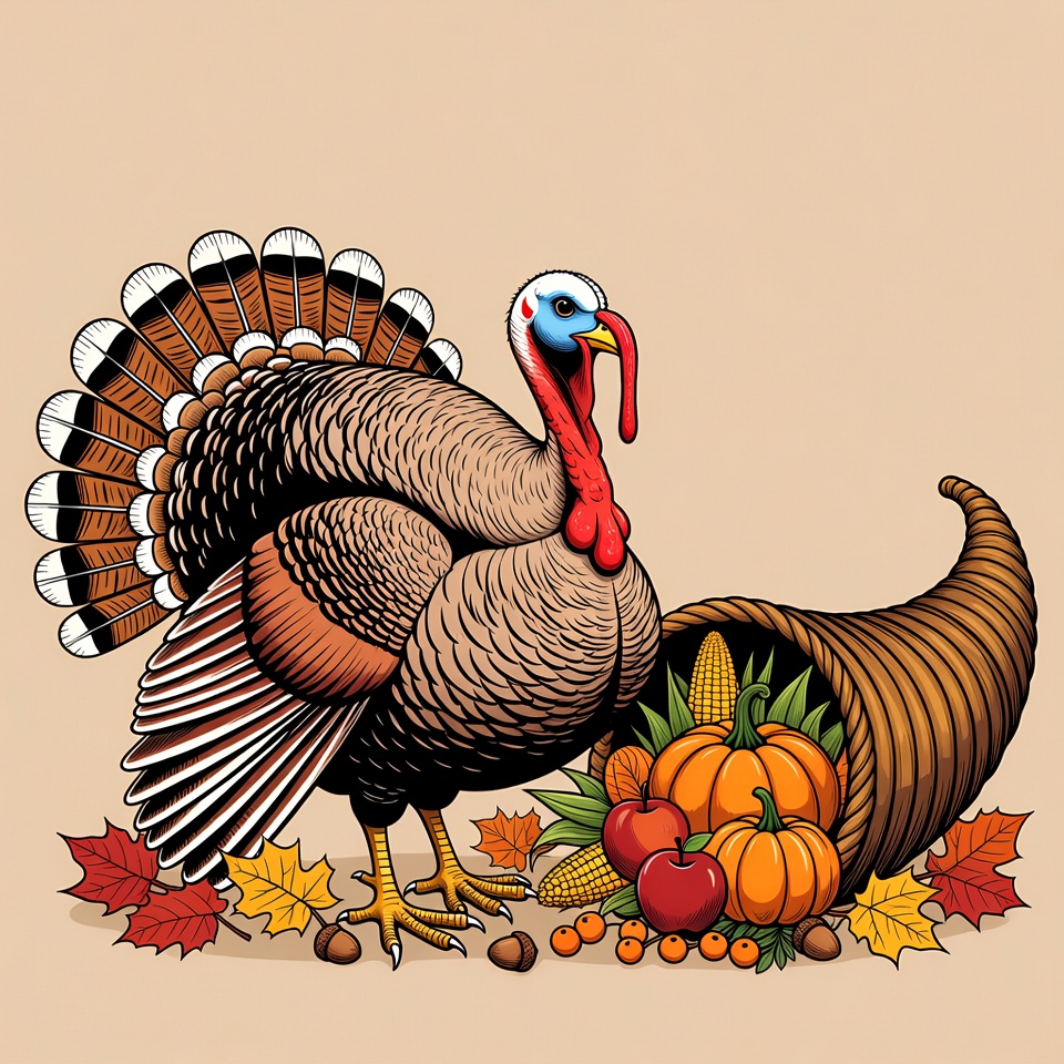A detailed illustration of a turkey standing beside a cornucopia overflowing with pumpkins, apples, corn, and nuts. Autumn leaves and acorns are scattered around the base on a beige background. The turkey features brown feathers, a red wattle, and blue eyes.