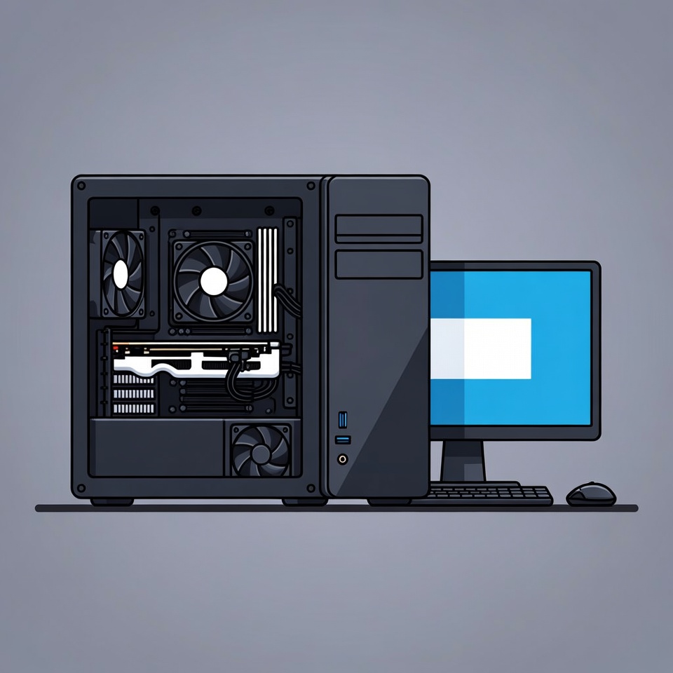 PC build, RGB lighting, cables, clipart, computer hardware, computer tower, desktop computer, fans, gaming setup, graphics card, illustration, isolated background, keyboard, line art, monitor, mouse, tech illustration, gaming PC