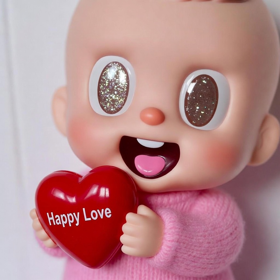 A cute baby doll with large glittery eyes and a big smile holds a red heart-shaped object labeled 'Happy Love'. The doll wears a pink sweater and stands against a white background. Its chubby cheeks and glossy vinyl features give it a playful, toy-like appearance.