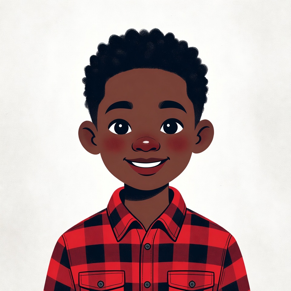A cartoon illustration of a young African-American boy with curly black hair smiles happily at the viewer. He has large expressive eyes and rosy cheeks, wearing a red and black plaid button-up shirt. The boy is centered on a white isolated background.