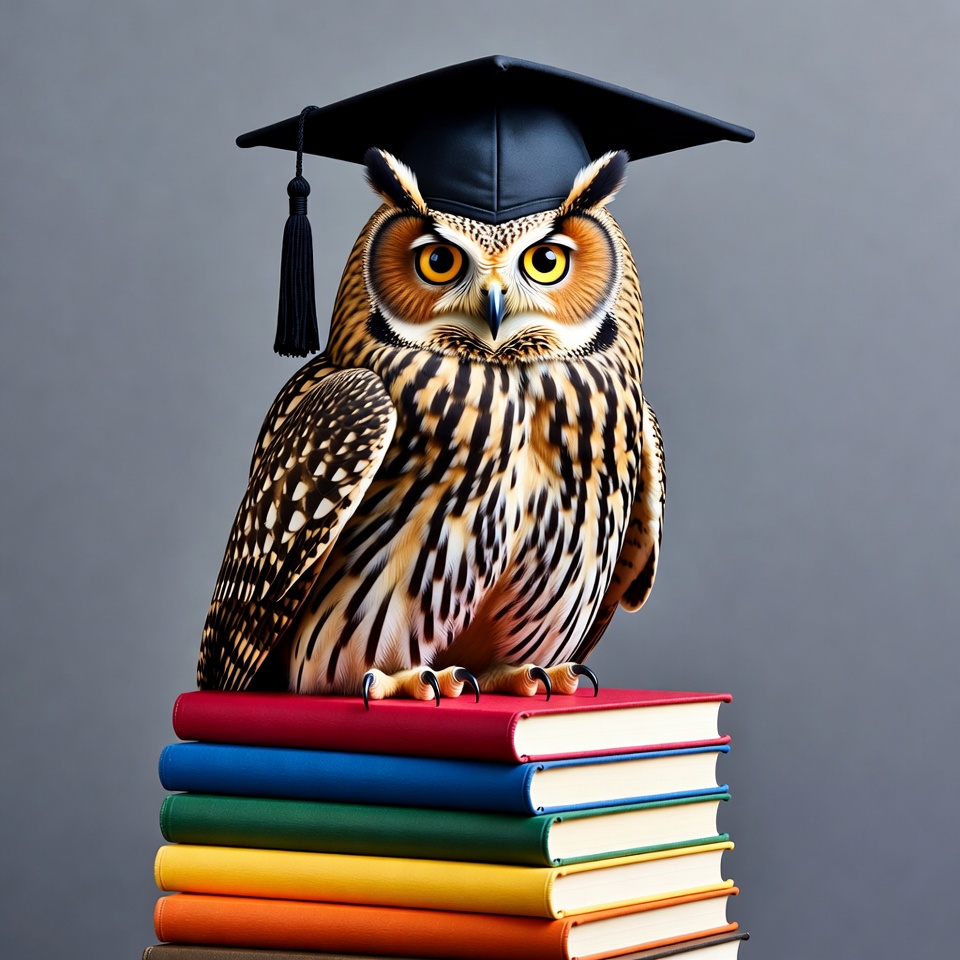 animal, bird, books, colorful books, education, feathers, graduate, graduation cap, gray background, isolated background, orange eyes, perched, stack, tassel, wisdom, owl