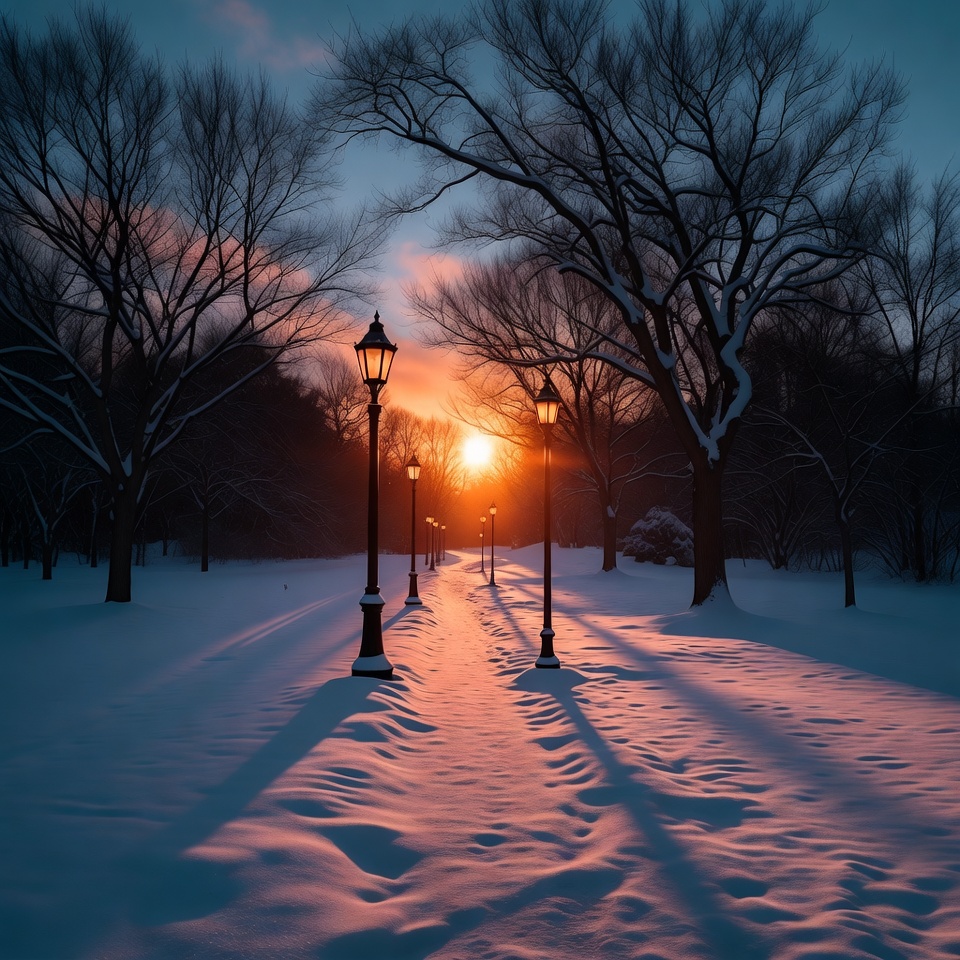 bare trees, evening light, frozen trees, glow, lampposts, lanterns, orange sunset, park path, path, pathway, silhouette, snow, snow landscape, snow shadows, snow-covered ground, snowy trail, street lanterns, sunset, sunset glow, trees, vintage lanterns, winter, winter scene, winter sunset, snowy path
